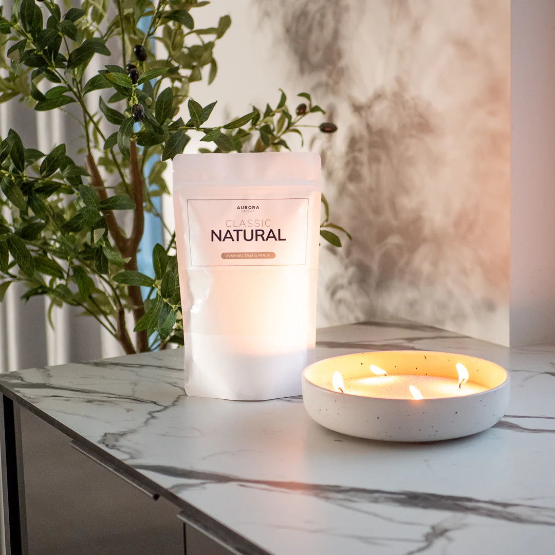 Nomainiet garlaicīgas sveces ar Aurora Candles vaska pērlēm. Tos var pieskaņot jebkurai jūsu mājas interjera detaļai. -
